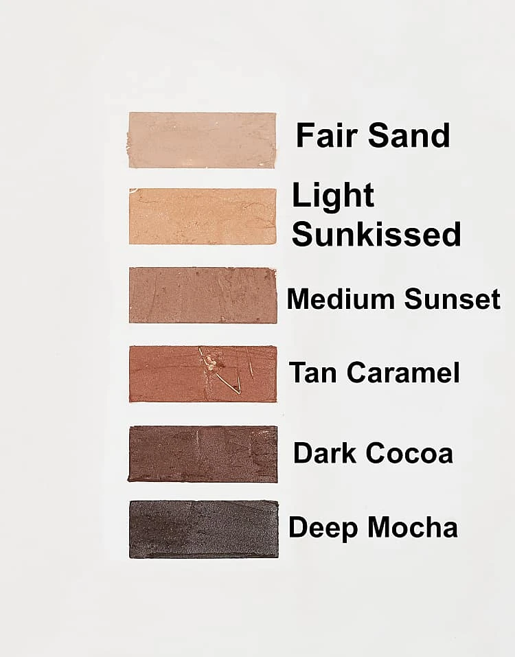 | COLOUR | Deep Mocha, Dark Cocoa, Light Sunkissed, Medium Sunset, Fair Sand, Tan Caramel |